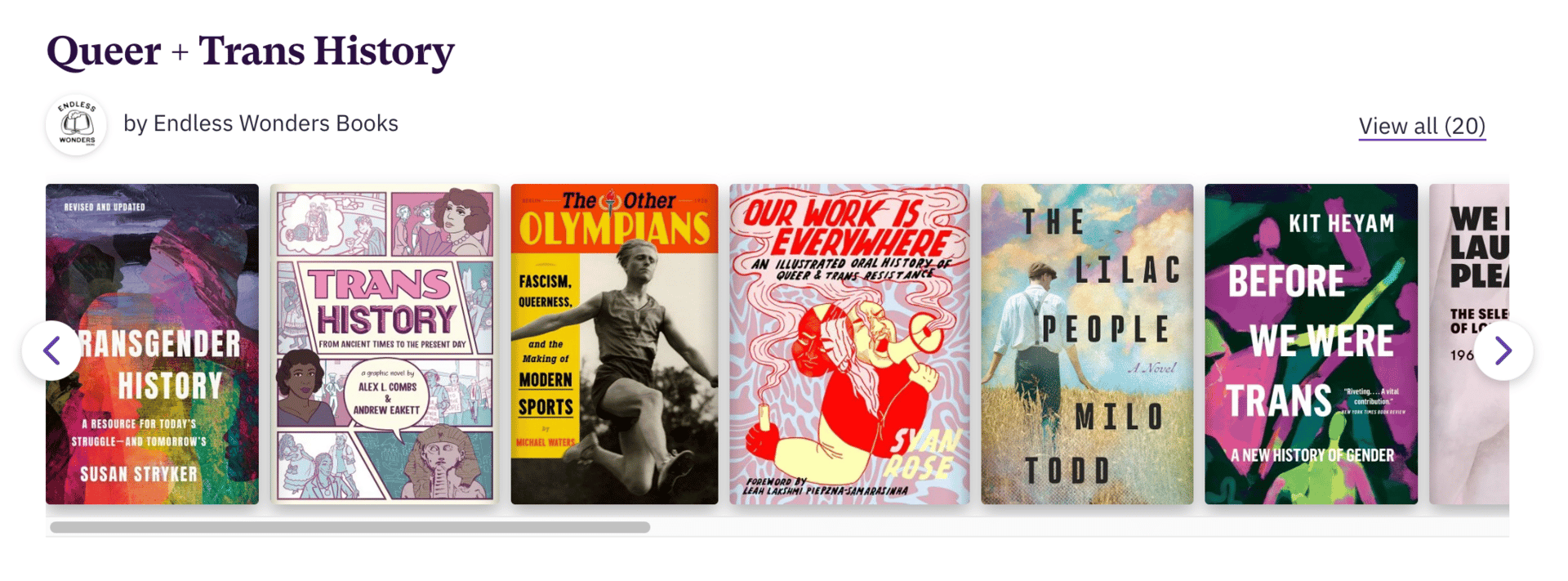 Screenshot of our Queer + Trans History list on our Bookshop.org page.