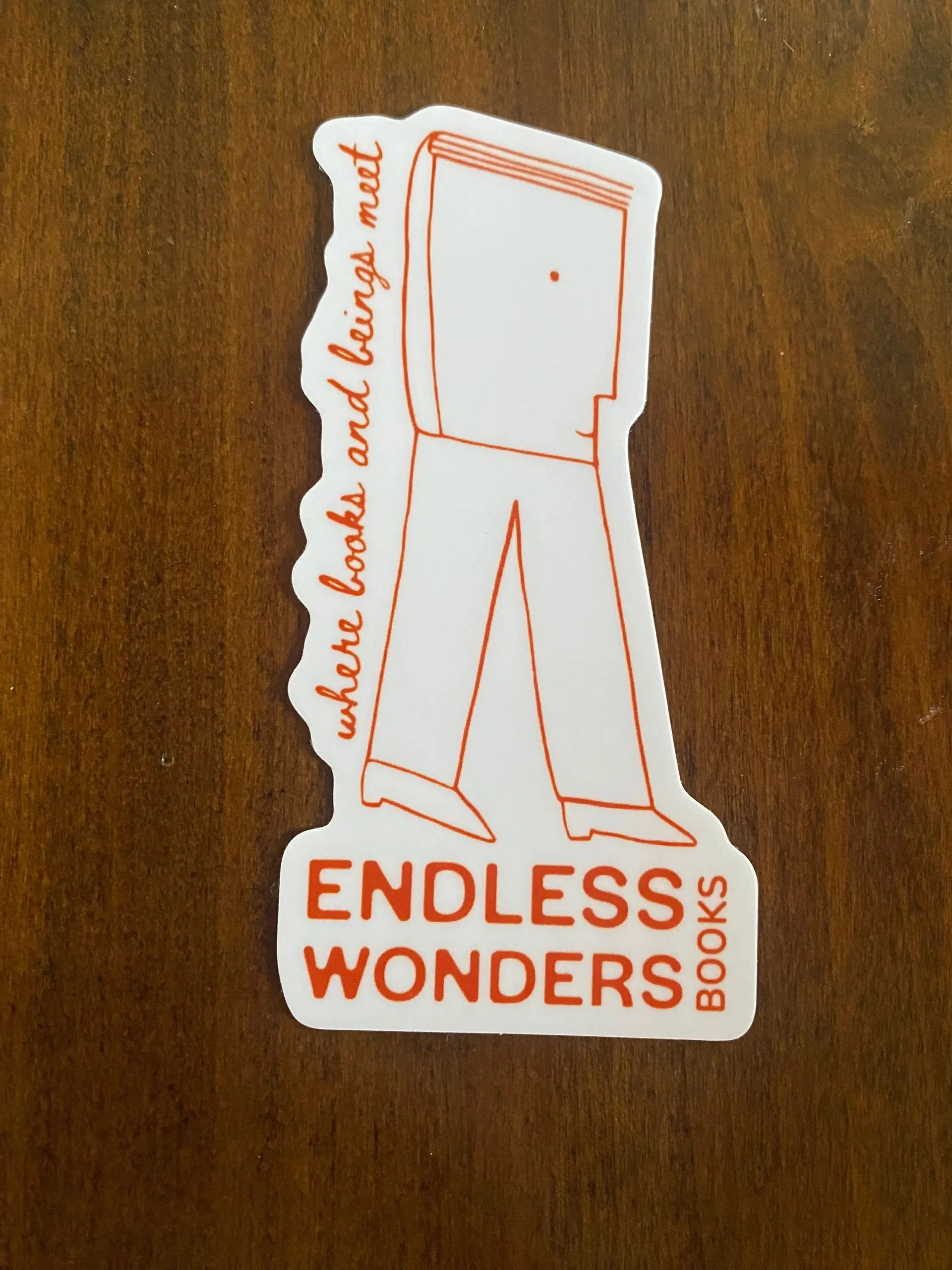![]() Image of a sticker using our main logo in lavender on top of a wood table. | ![]() Image of a sticker using our secondary logo, an anthropomorphized book with a face and legs, with our tagline āwhere books and beings meetā in orange, laying on top of a wood table. |