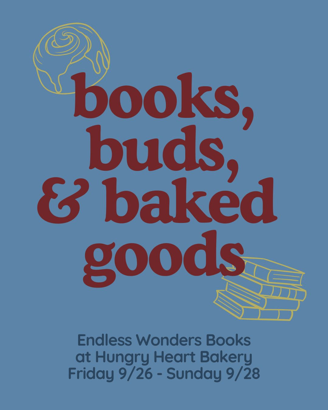 ![]() Image of blue sky with green tree branches. Golden yellow text overlays that says “park reading hours; thursday, september 25, 6pm at clinton park” | ![]() poster with blue background and maroon text that says “books, buds and baked goods; Endless Wonders Books at Hungry Heart Bakery; Sept 26-28” | ![]() Poster with white background and maroon and olive accents. Text reads “Banned Books Week Book club & pop-up w/Endless Wonders Books; Thursday, oct 9: 5-9pm at Bar Loon 3326 SE Belmont St” |